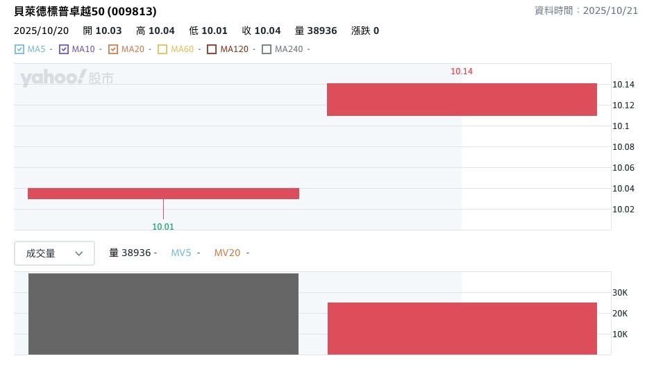 009813貝萊德 iShares 安碩標普500卓越50 ETF 剛上市,目前股價與發行價相當接近,每股淨值及股價皆約為10元新台幣(截至2025/10/21)。