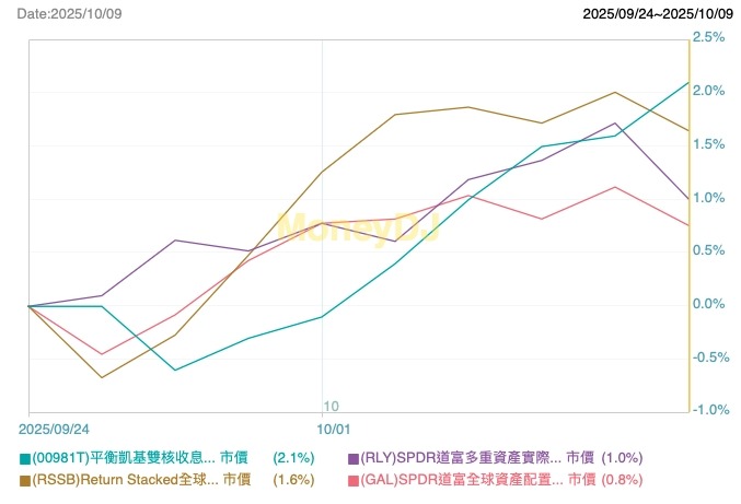 00981T 凱基雙核收息債股平衡型ETF 定位主要以「股債平衡型」策略為核心。該ETF目標客群是追求穩定月配息及成長潛力的投資人。截至2025/09/30,市值規模約2,236.18(百萬台幣)。與同類型ETF(RLY、RSSB、GAL)比較,自成立至今(截至2025/10/09)報酬率,一個月內的表現沒有明顯差別