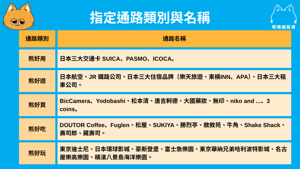 - 指定商店:在指定的日本商店消費,並完成活動登錄,額外加碼回饋 6%,每期上限為 500 元,與一般消費合計最高回饋達 8.5%,指定的商店如下。