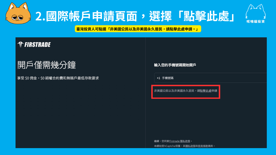 - 選擇「國際帳戶」,臺灣投資人可點選「非美國公民以及非美國永久居民,請點擊此處申請。」