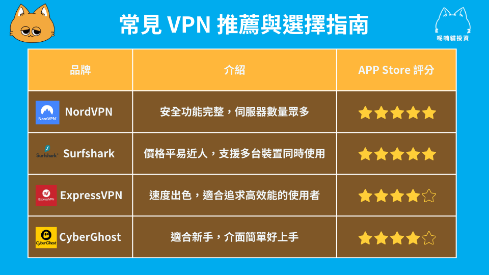 市面上 VPN 品牌眾多,常見且APP Store評價高分的 VPN 包含: